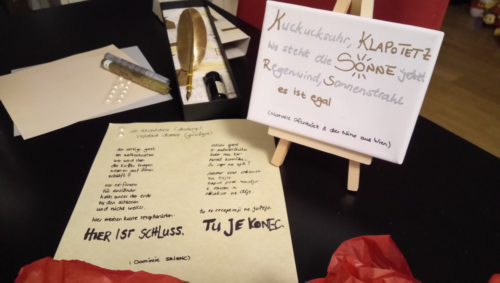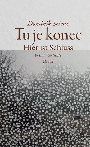 Das erste Gedicht (ab nachhause [drohung] | pojdiva domov [grožnja]) stammt von Dominik Srienc und ist aus seinem Gedichtband „Tu je konec. Hier ist Schluss“, erschienen im Drava Verlag 2014. Warum ich es gewählt habe? Ich kenne Dominik schon länger und er hat mir sein Buch zukommen lassen. Bis heute habe ich es nicht geschafft, es zu rezensieren und als ich von der Bloggeraktion gehört hatte, wusste ich, dass ich dieses Gedicht auf jeden Fall nehmen muss. Das Buch (ISBN 978-3-85435-739-1) beziehungsweise die Gedichte, die auf Deutsch und Slowenisch abgeruckt sind, muten sehr traurig an und sind voller Emotionen. Hier ist das Cover seines Buches: