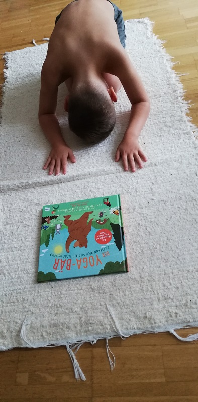 Da ich selbst gerne Yoga praktiziere, kam dieses Buch wie gerufen, denn zur Zeit (es ist grad Mitte August) sind die Kinder in den Sommerferien zuhause und wir unternehmen gemeinsame Dinge. Unter anderem auch Yoga. Vor allem mein jüngster Sohn, der fünfeinhalb Jahre alt ist, mag es sehr, die Übungen im Buch durchzumachen. Sogar ganz selbstständig und alleine. Während ich also ein Fitnessvideo absolvierte, schnappte er sich eine Yogamatte und blätterte die einzelnen Seiten des Buches von Christiane Kerr durch und folgte den Illustrationen von Julia Green, da er selbst noch nicht lesen kann. Bis auf ganz wenige Korrekturen von meiner Seite konnte er alle Übungen super alleine ausführen. Heute habe ich meinen Sohn noch gebeten, dass er seine Lieblingsposition nochmal am Teppich machen soll – für dieses Foto: